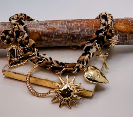 This stunning necklace features a unique braided design adorned with an array of charming pendants, including celestial motifs and intricate symbols. The combination of rich textures and gold-tone accents adds a touch of elegance, making it perfect for both casual and dressy occasions. With its adjustable length, this necklace ensures a comfortable fit while allowing you to express your unique style effortlessly!