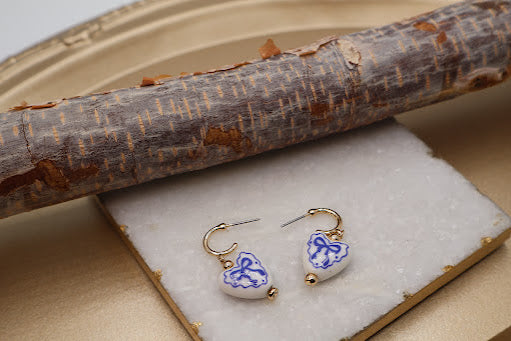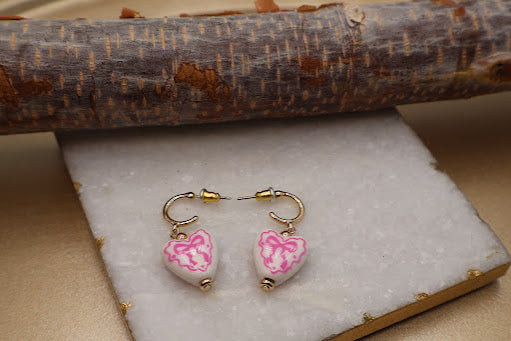 These adorable hoop earrings feature heart-shaped ceramic-style charms embellished with delicate bow details. Lightweight and playful, they add a charming touch to your everyday looks or elevate casual outfits. Choose your favorite color to express your unique style!