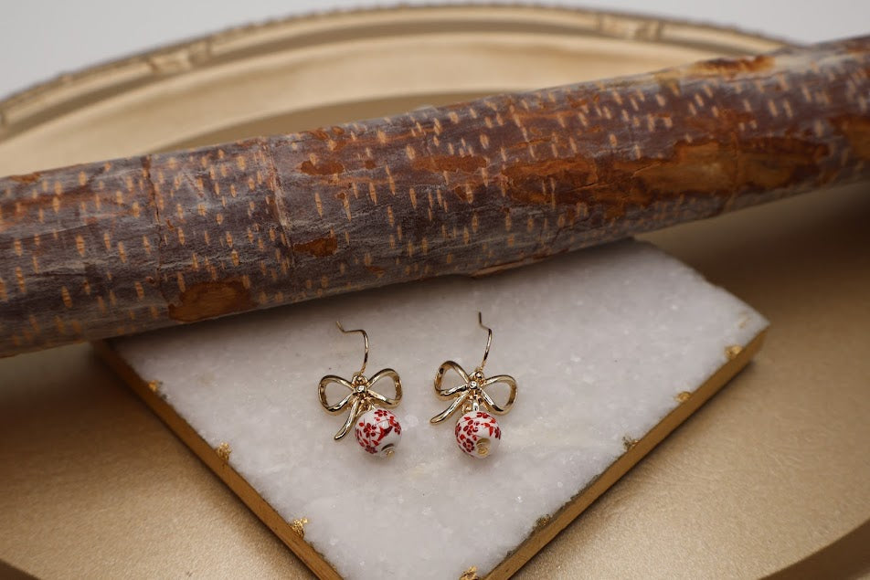 These earrings feature a stunning metal bow design paired with beautifully crafted ceramic balls adorned with a vibrant red floral pattern. The elegant dangle style gives them a playful yet sophisticated vibe, making them perfect for both casual outings and special occasions. Brighten up your jewelry collection with these enchanting earrings that beautifully combine whimsy and elegance!