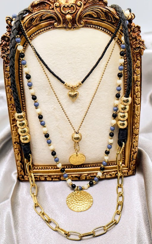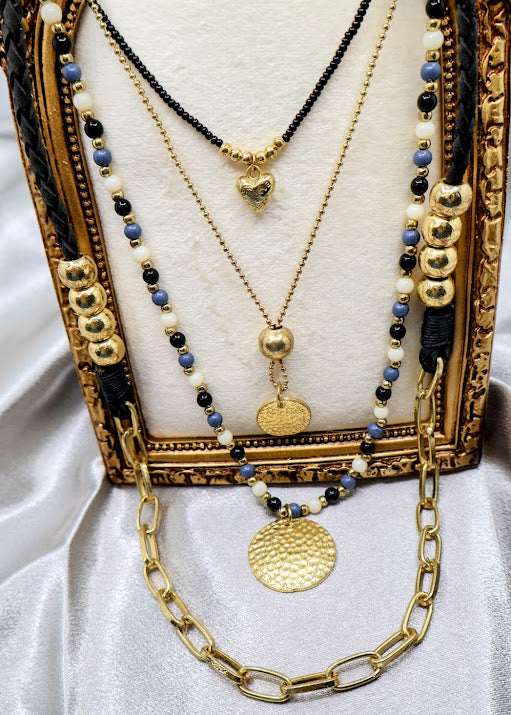 Elevate your style with the Cobalt Reverie Layered Necklace, a stunning four-layer piece that beautifully blends black, denim blue, cream, and gold beading with elegant gold details. This versatile necklace features a lobster claw closure and a 2-inch extender for adjustable length. Adorned with unique charms and pendants, including a delicate gold heart and textured gold disks, it adds a touch of sophistication to any outfit. Perfect for layering or making a statement on its own, this necklace embodies a harmonious blend of colors and styles, making it a must-have accessory!