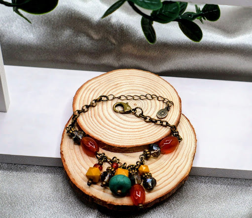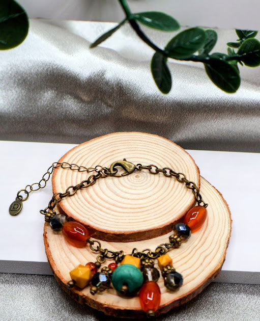 Embrace the vibrant spirit of the desert with the Desert Sunburst Charm Bracelet. This stunning bronze bracelet features an eclectic mix of bead charms in warm tones of amber, turquoise, and deep reds, capturing the essence of a sun-drenched landscape. With a 2-inch extension and a secure lobster claw closure, this bracelet offers a comfortable fit at a dimension of 2 inches. The playful combination of shapes and colors creates a joyful, bohemian vibe, making it the perfect accessory for adding a touch of warmth and personality to any outfit. Ideal for stacking or wearing solo, it celebrates the beauty of nature and free-spirited style!