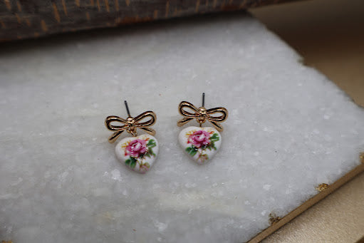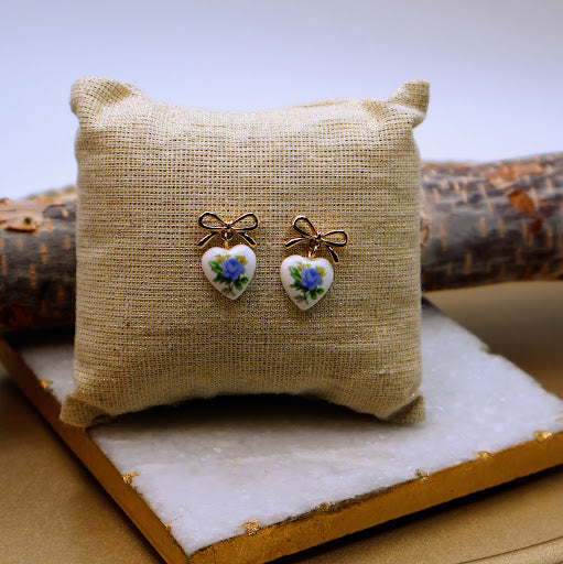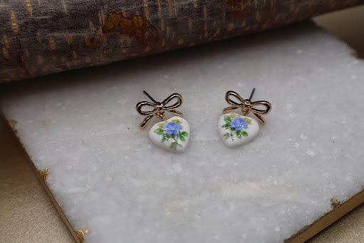 These sweet and dainty heart-shaped drop earrings feature a delicate floral print complemented by polished gold bow studs. Available in charming pink or serene blue, they are perfect for romantic looks, spring outfits, or thoughtful gifting. Elevate your style with these delightful earrings that capture the essence of femininity and grace!